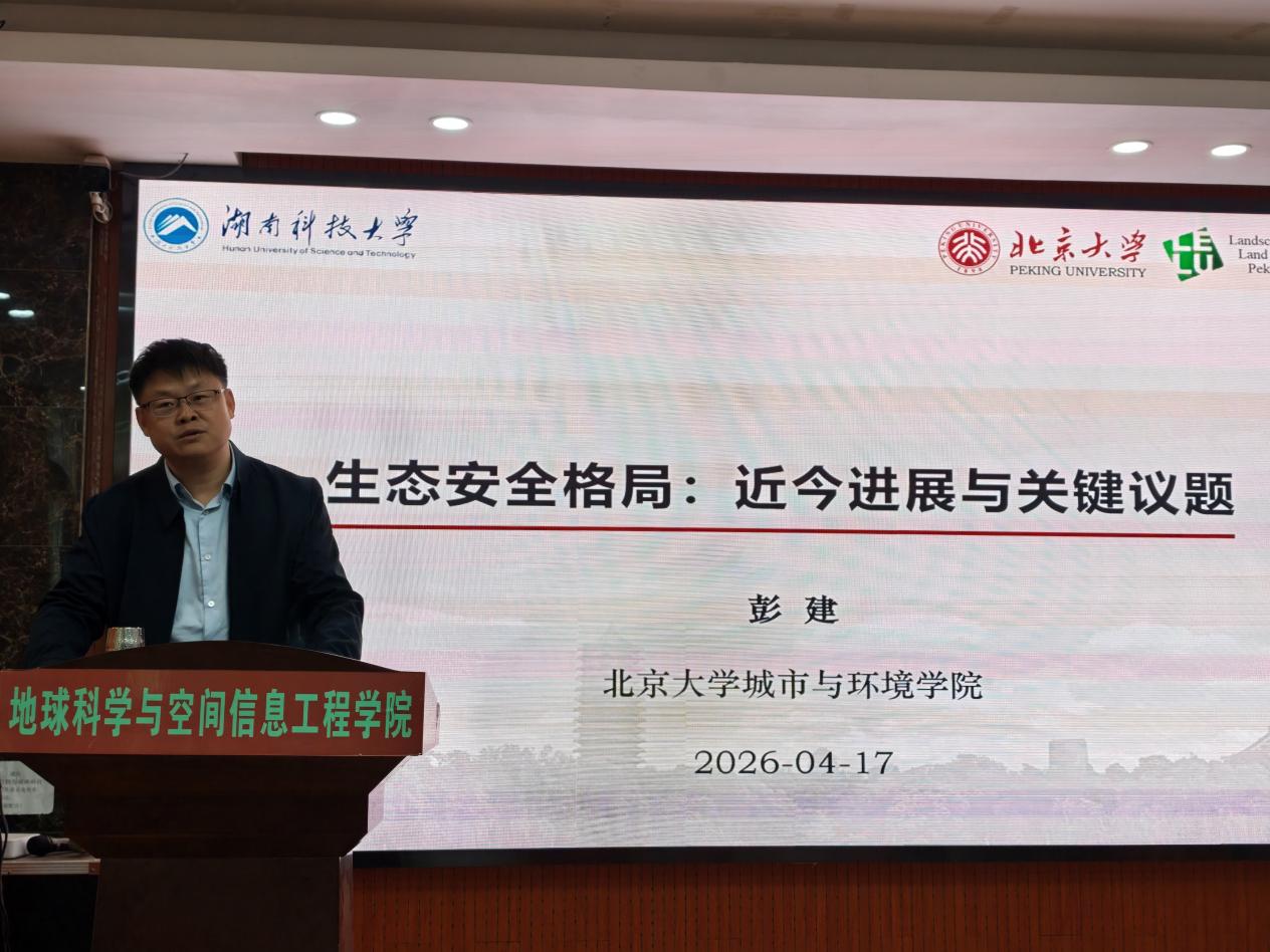 2026年4月17日下午,北京大学博雅特聘教授,教育部长江学者彭建教授应邀做客日韩无码 “湘江高端学术论坛”,为师生带来题为《生态安全格局:近今进展与关键议题》的学术报告。报告由日韩无码 院长朱永建主持,日韩无码 党委书记余光辉、副院长唐志光、本科生院副院长王欣以及中青年教师和学生参加了本次讲座。